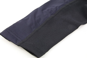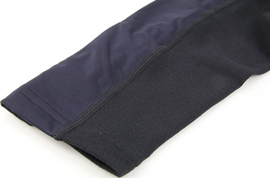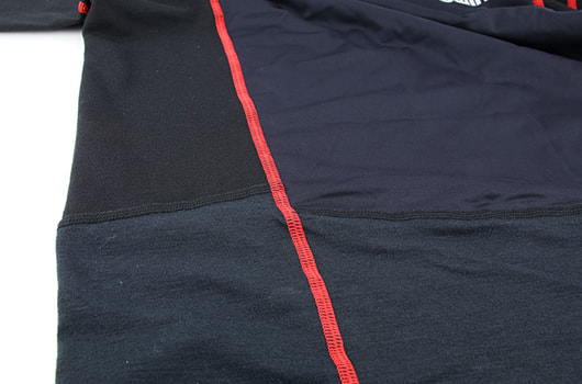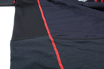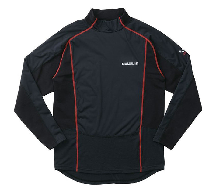 肉厚の「光電子®」をベースに、おへそから上の部分と上腕部、そして背中部分に防風素材「ザムザ®」を貼り付けて防風性をアップさせた超防寒仕様。「ザムザ®」は防風ながらも非常にストレッチの効く素材なので動きやすさが必須のアンダーウエアとしてもしっかり機能してくれる。また、腰回りが気にならないよう腰、裾の後部分が少し薄手の素材になっているので、違和感なくパンツにインできるハイブリッド仕様になっている。