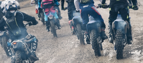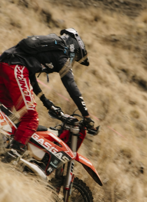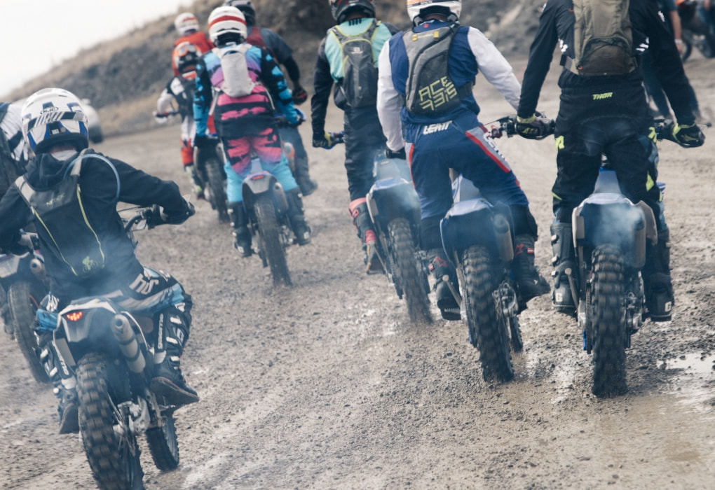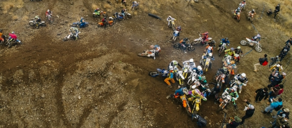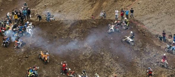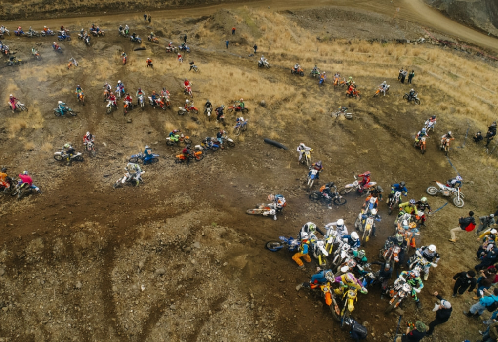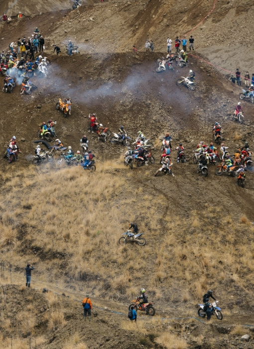 午前9時50分。200人のライダーが一堂にスタート地点へ集い、全員がスロットルを捻り、エンジンを温める。ライダーたちの鼻息の荒さを表すかのように、その鼓動は力強く、この大会のファンファーレのよう。そして、午前10時。打ち上げられた花火とともにスタート。最初の難関である限りなく壁に近い急斜面から、筆者を含むオフロードの初心者は圧倒された。スキルや経験のあるライダーは難なく超えられるのだが、それはあくまで極一部。ほとんどは、転ぶ、落ちる、吹っ飛ぶ、といった様子。インタビュー時に石戸谷さんが放った「上からバイクが飛んでくるので気をつけてください」という奇天烈な一言の意味を開始1分で理解した。