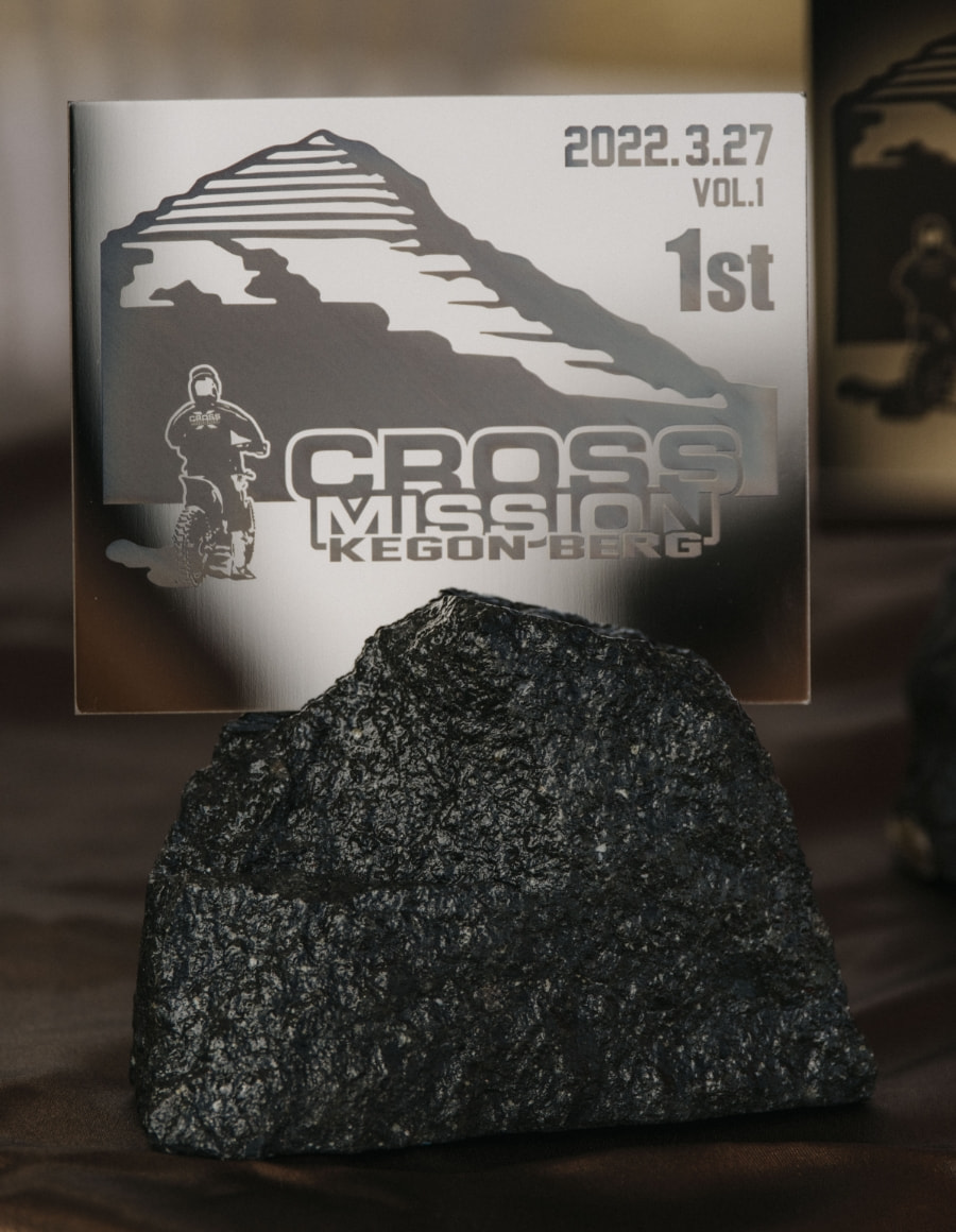上位10名にはトロフィーを授与。舞台となった人の森 華厳工場で採取した石を使用したこのイベントらしいトロフィーだ。