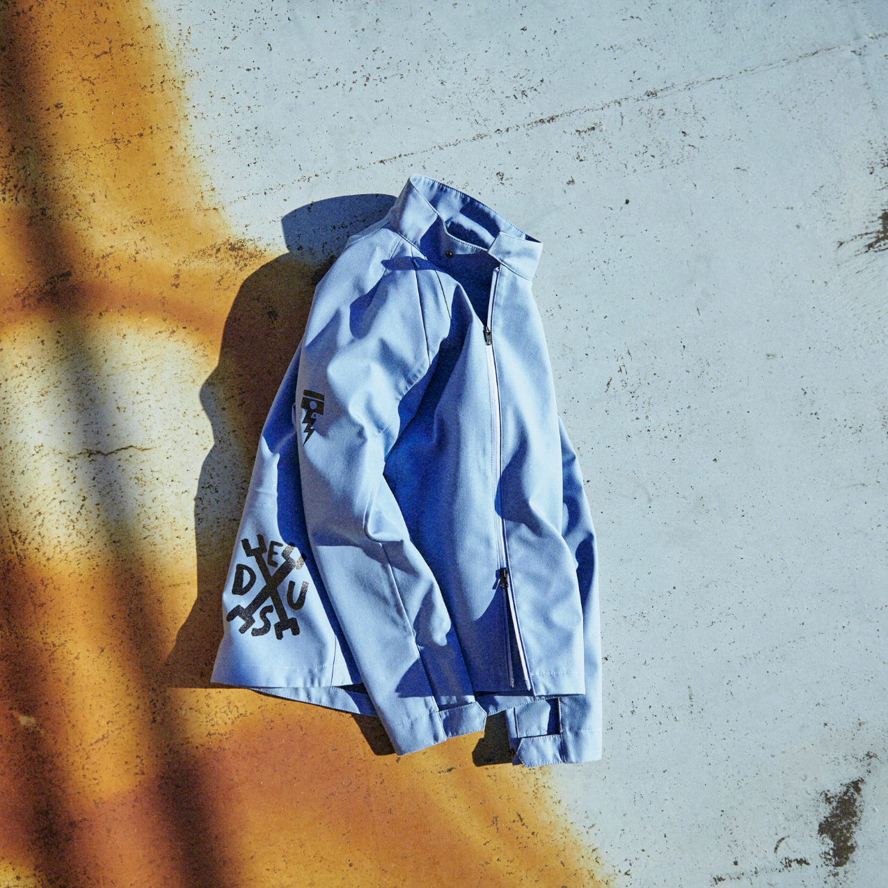 これからの季節にぴったりな、鮮やかなスカイブルーのカラーリングが目を惹く本アイテム。ライディングジャケットをベースにデザインしつつも、装飾要素を極限まで減らしソリッドでミニマルな印象に。ギアとしての武骨な印象は残しつつも、都市生活の中でも取り入れやすいように工夫が施されている。素材は防弾チョッキなどの防護服に用いられるアラミド繊維を配合した素材「Dynamonus」を使用することで、耐久性・軽量性を向上。また、防水透湿素材「Dermizax」をラミネートすることで、防風・防水透湿性も持ち合わせ機能性も十分。右袖と後身頃の右下にプリントされているのは、デウス・エクス・マキナが今回のコラボレーションのためにアーカイブからセレクトしたスペシャルなグラフィック。ミニマルな佇まいの中でもカルチャーの要素が光る秀逸な一着。