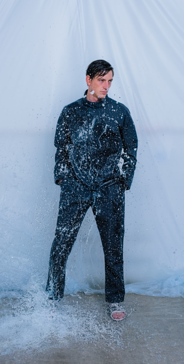 コーディネートに取り入れやすいスレートのカラーリング、装飾要素を抑えたソリッドでミニマルなデザインが印象的なライディングジャケットとテーパードパンツ。素材には防弾チョッキなどの防護服に用いられるアラミド繊維を配合した特殊素材「Dynamonus」を使用することで、耐久性・軽量性を向上。そこに防水透湿素材の「Dermizax®」をラミネートすることで、防水透湿性に加え防風性も持ち合わせた。同素材を用いたアイテムのため、セットアップでの着用はもちろん、単体としても様々なコーディネートにおいても活躍してくれることは間違いなし。表面に水が染みるように見えるものの、ラミネートにより内側への水の浸透がしにくい設計だ。激しい雨風が来ようともインナーはドライに保ってくれる。