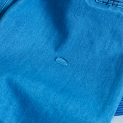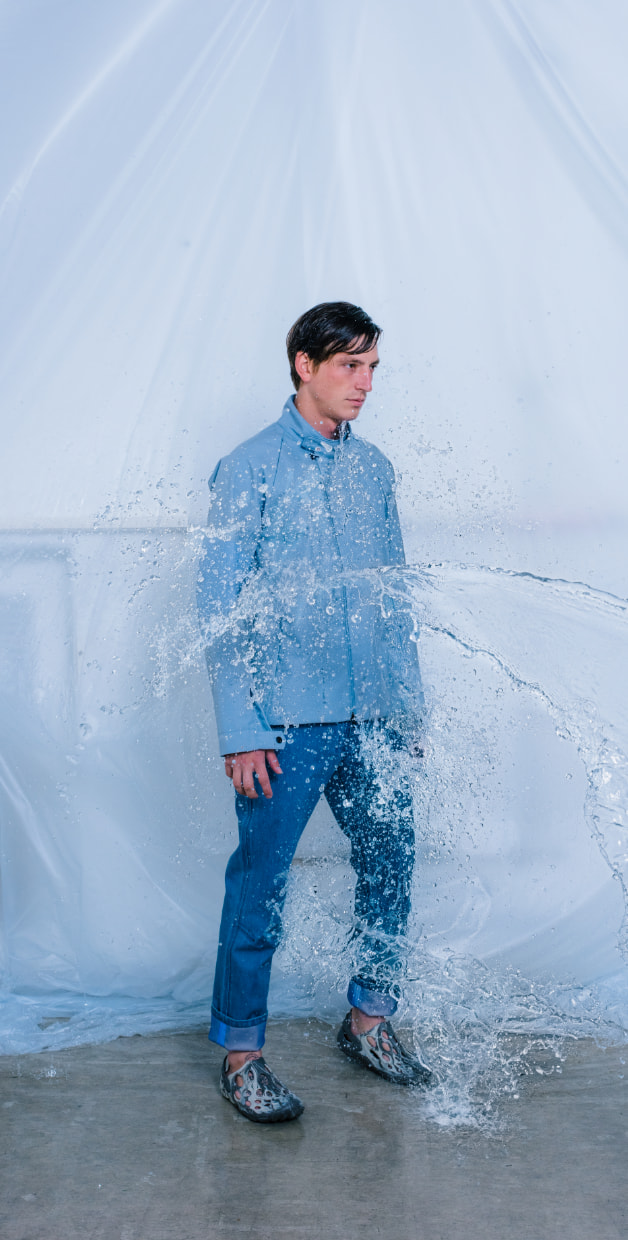 前述の「Dermizax®」素材をラミネートで施したライディングジャケットは3色展開。シックな色味のスレートに加え、何にでも合わせやすいネイビー、そしてこちらのスカイブルーだ。しっかりとした防水透湿性能による安心感にプラスして、綺麗な発色による明るい色味は気持ちを高めてくれると共にコーディネートにも彩りを与えてくれるに違いない。そんな同ジャケットに合わせるのは、防水透湿といえばの素材「ゴアテックス」を採用したストレートシルエットのデニムだ。身に付ける者の様々な体勢を考慮し、膝部分は立体裁断パターンを採用。動きやすさも折り紙付きだ。ゴアテックスを採用したデニムをここまで薄い色合いで作るのは至難の業。ブランドの生地開発における努力の賜物と言えるだろう。