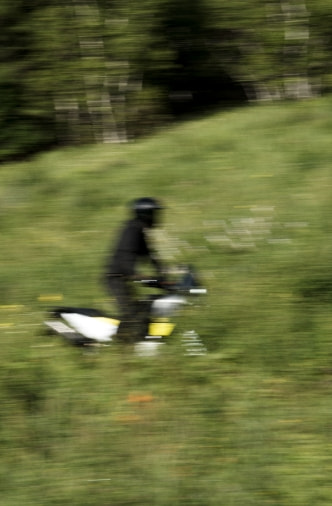 間伐した木材を運ぶ林道を使い、オフロードバイクを楽しむ。