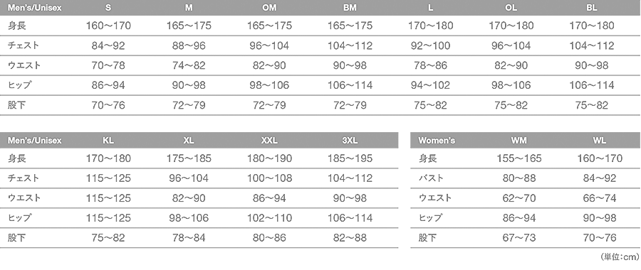 | メンズ・ユニセックス | S | M | OM | BM | L | OL | BL | KL | XL | XXL | 3XL |