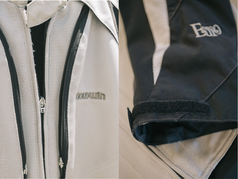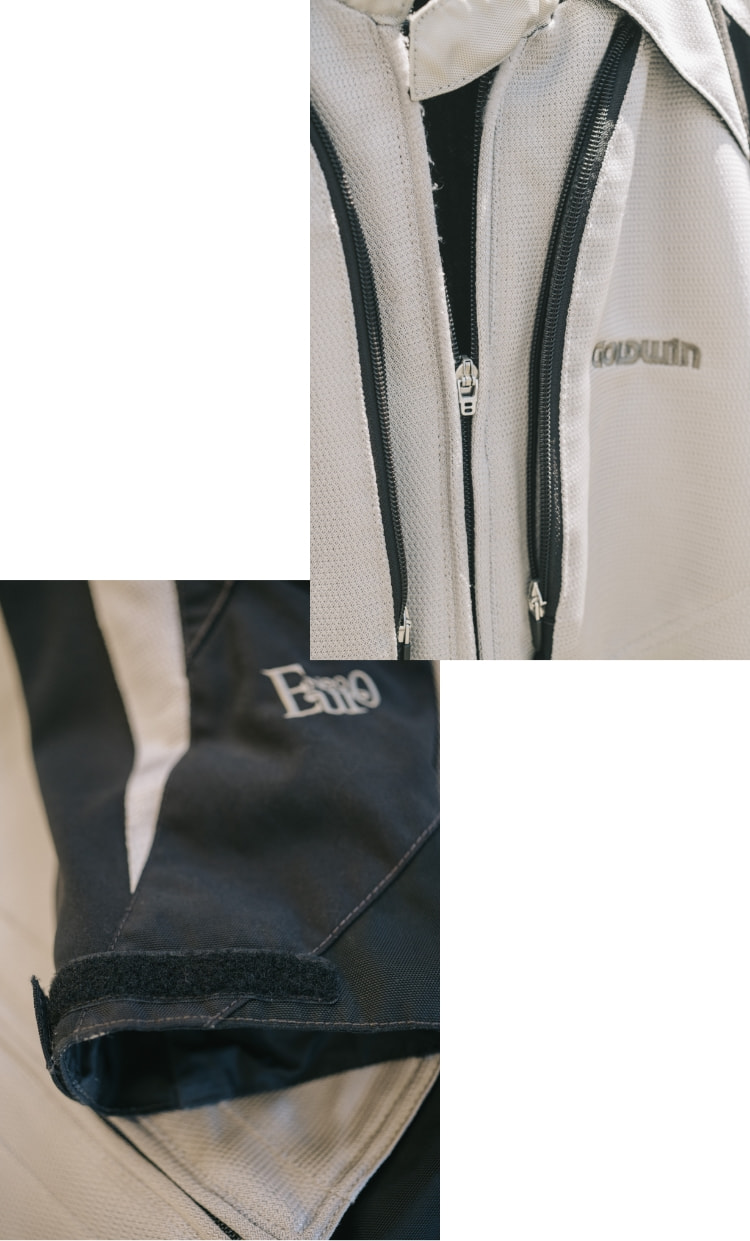 「ユーロ(GWMのプレミアムウエアシリーズ)を長年着ています。ヨーロッパ調のデザインがもうとにかくかっこよくて。ツーリングに参加していると、『これどこのギアですか?』と聞かれることもよくあるぐらいです。何着か持っているのですが、今日私が着ているのは2016年に出たユーロ20周年モデルの一着です。このモデルからインナージャケットを着込めるという画期的な仕組みが取り入れられたんです。黒いボディに金色の文字、赤いラインもまたかっこいいですよね。取材のためエアーガンで掃除していたんですけど、パンツのお尻の部分に穴が空いていることに気づきました。そもそも生地が二重になってて頑丈ではあるのですが、長年の使用で擦り切れてしまったんですね。面ファスナーも粘着が弱くなってきつつあります」。