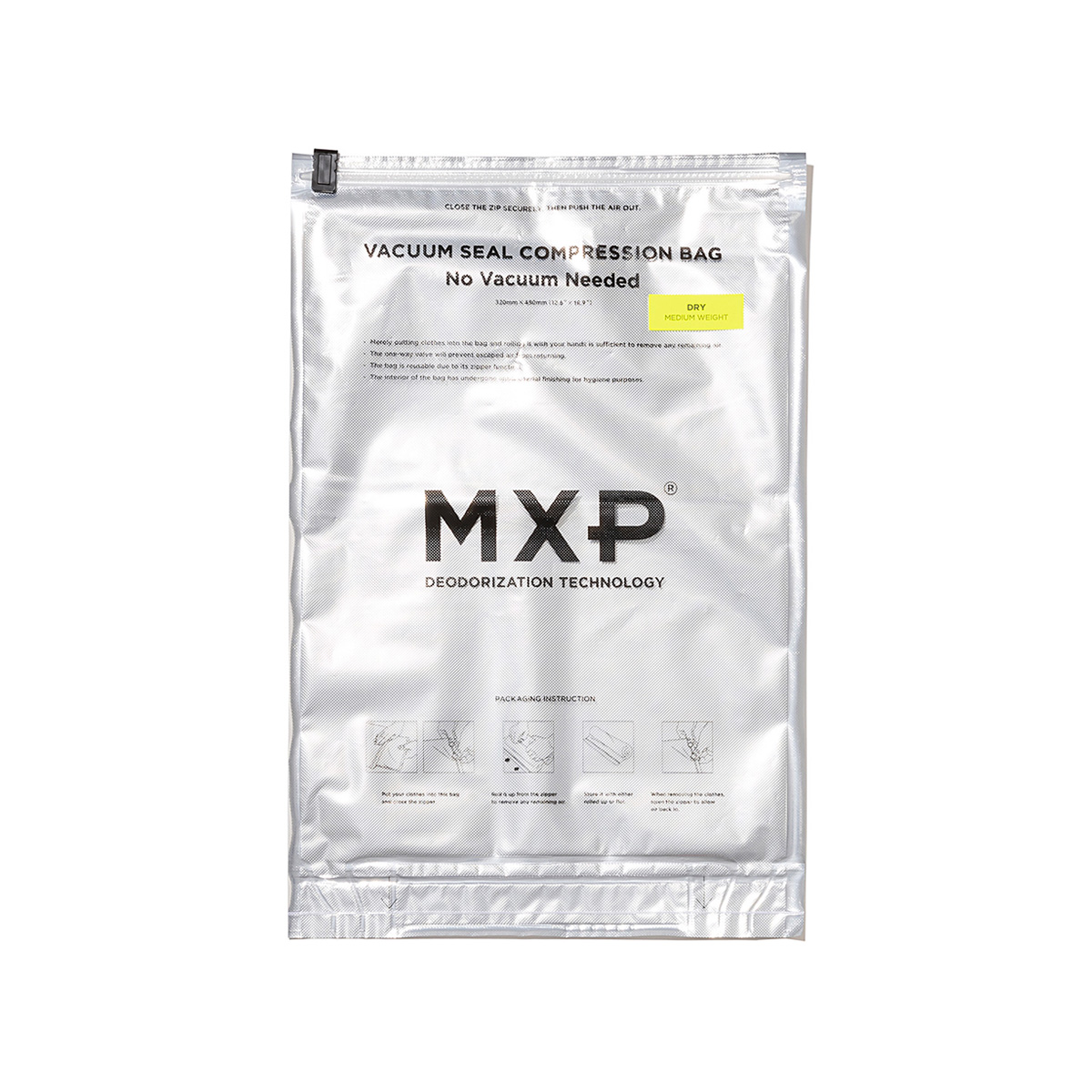 すべてのアイテムは、MXPオリジナル バキュームバッグ(衣類圧縮袋)にパッケージされています。