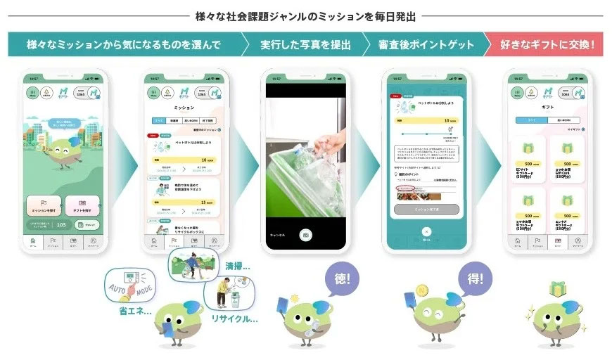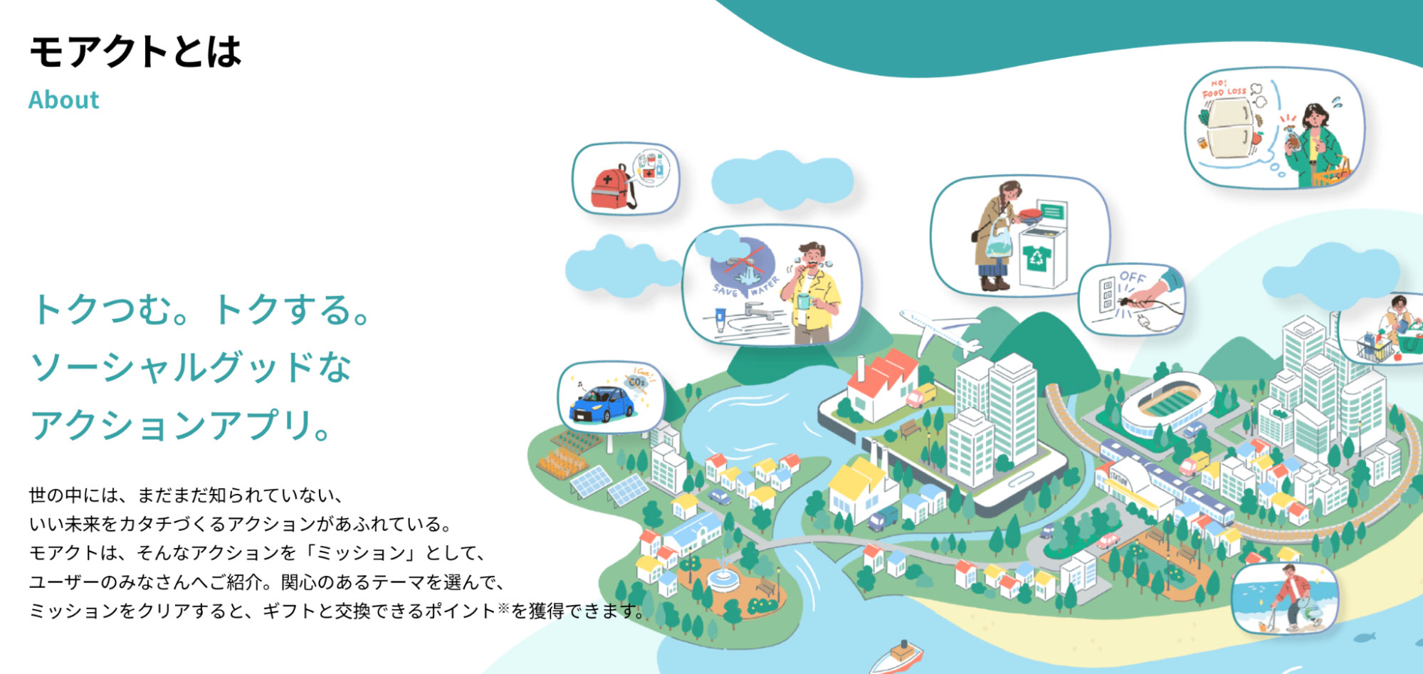 関西電力発の社会貢献活動促進サービス「モアクト」には、様々な企業・団体が提示するミッションをクリアする(=トクつむ)と、お得なポイントがもらえる(=トクする)仕組みがあります。日常生活の中で社会課題に楽しくチャレンジできるミッションを通じて、これまでも気候変動への対策に積極的に取り組んできました。