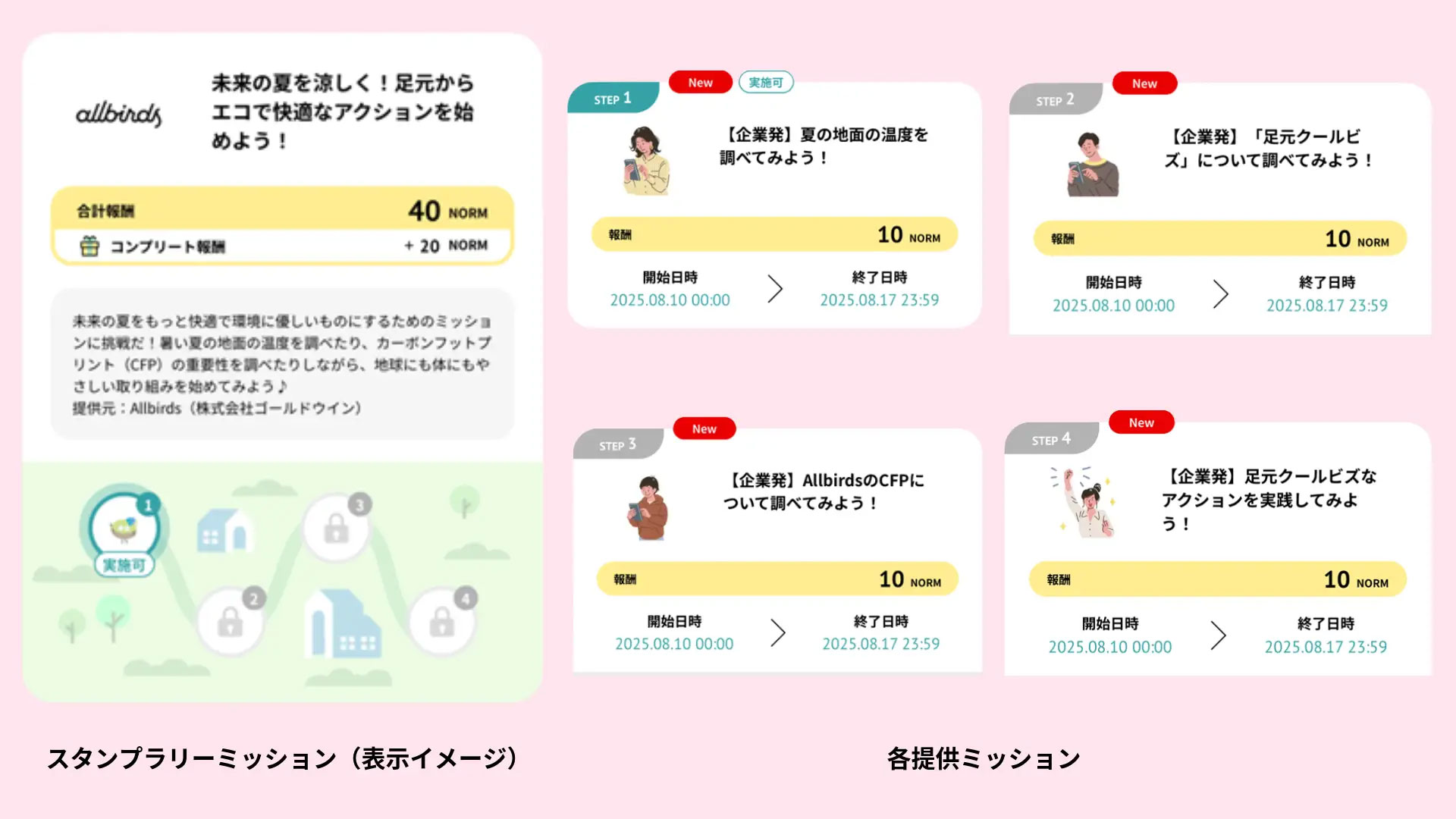様々な「学び」や「アクション」を通じて、スタンプラリーを完成させていきます。なかには「製品づくりの過程で生まれる二酸化炭素を“見える化”する〈カーボンフットプリント〉を知るミッション」や、「足元を冷やすアクションを実際にやってみるミッション」があり、これらをクリアすると、ポイントを獲得できるのです。