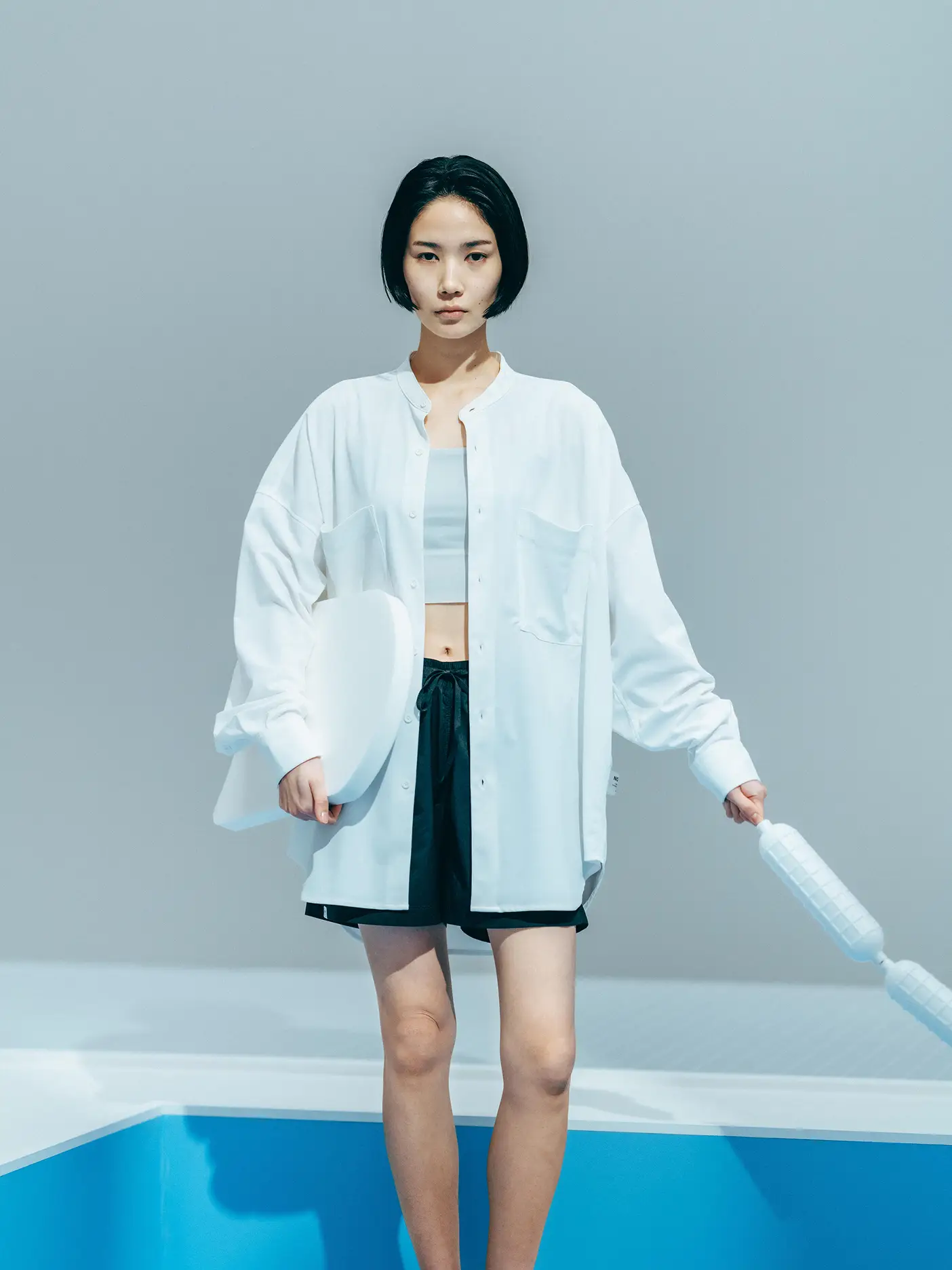 首元をすっきり見せるバンドカラーと、さっと羽織れるリラックスしたシルエット。ウォーターアクティビティのカバーアップから日常使いまで、シーンを選ばず、軽やかに着られる一着です。