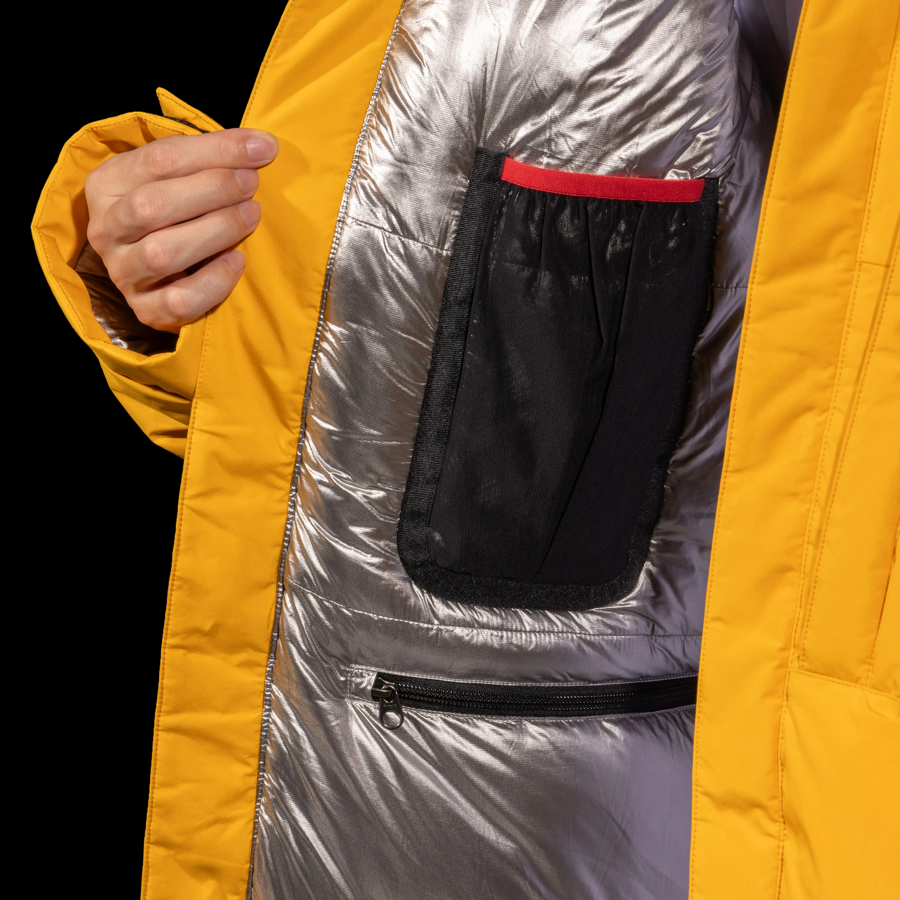 裏地はチタンコーティングされたナイロン素材を採用。吸収した熱を輻射することで、自然な保温性を体感できる。内側にはポケットとボトルホルダーも配置。