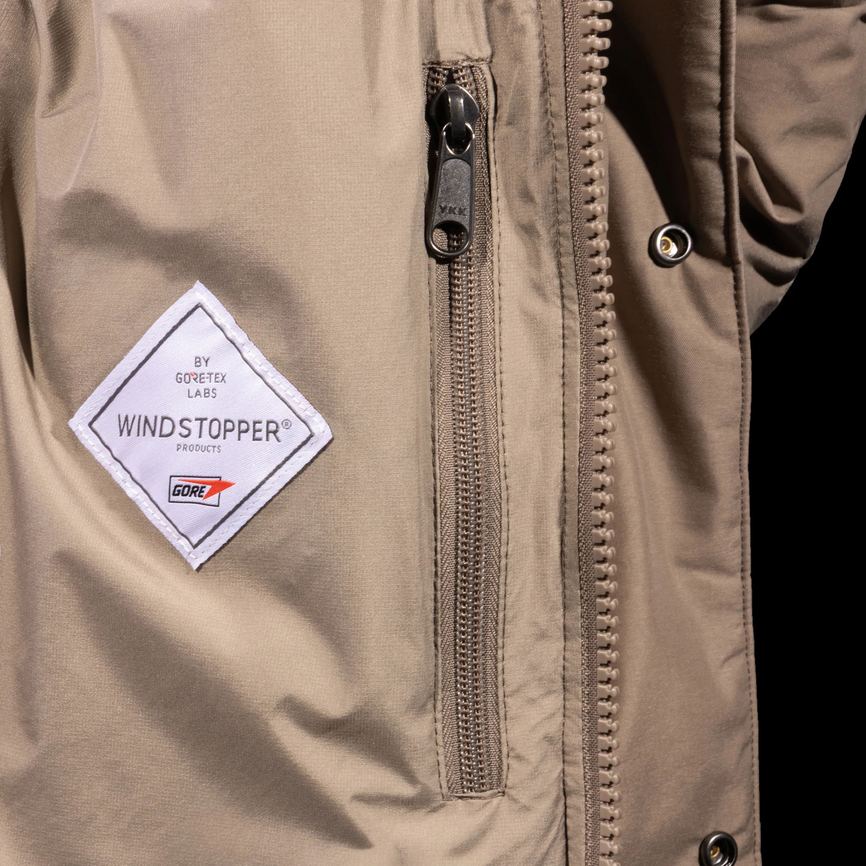 表地は30デニールのePE GORE-TEX WINDSTOPPERを採用し、高い防風性を追求。中わたには高い保温性を確保するリサイクルダウン。