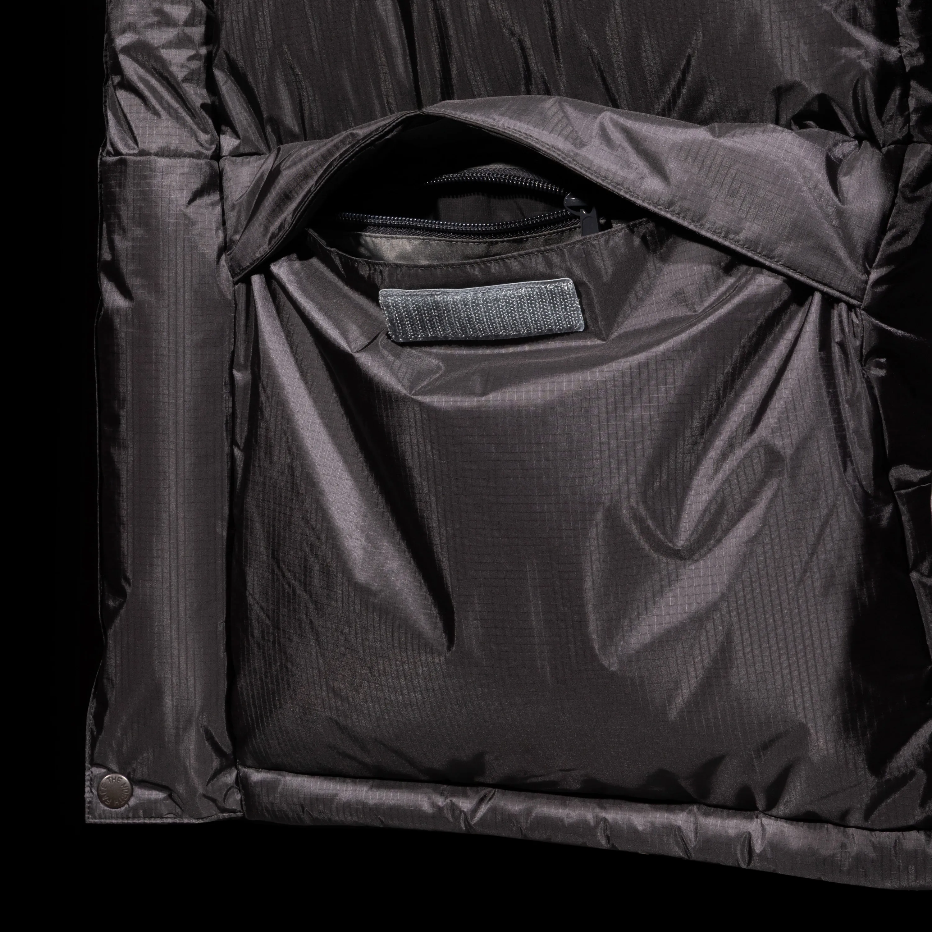 左右にファスナー付きポケットを配置。タウンスタイルにも映えるデザインと、保温性と軽さを追求した機能を兼ね備える。