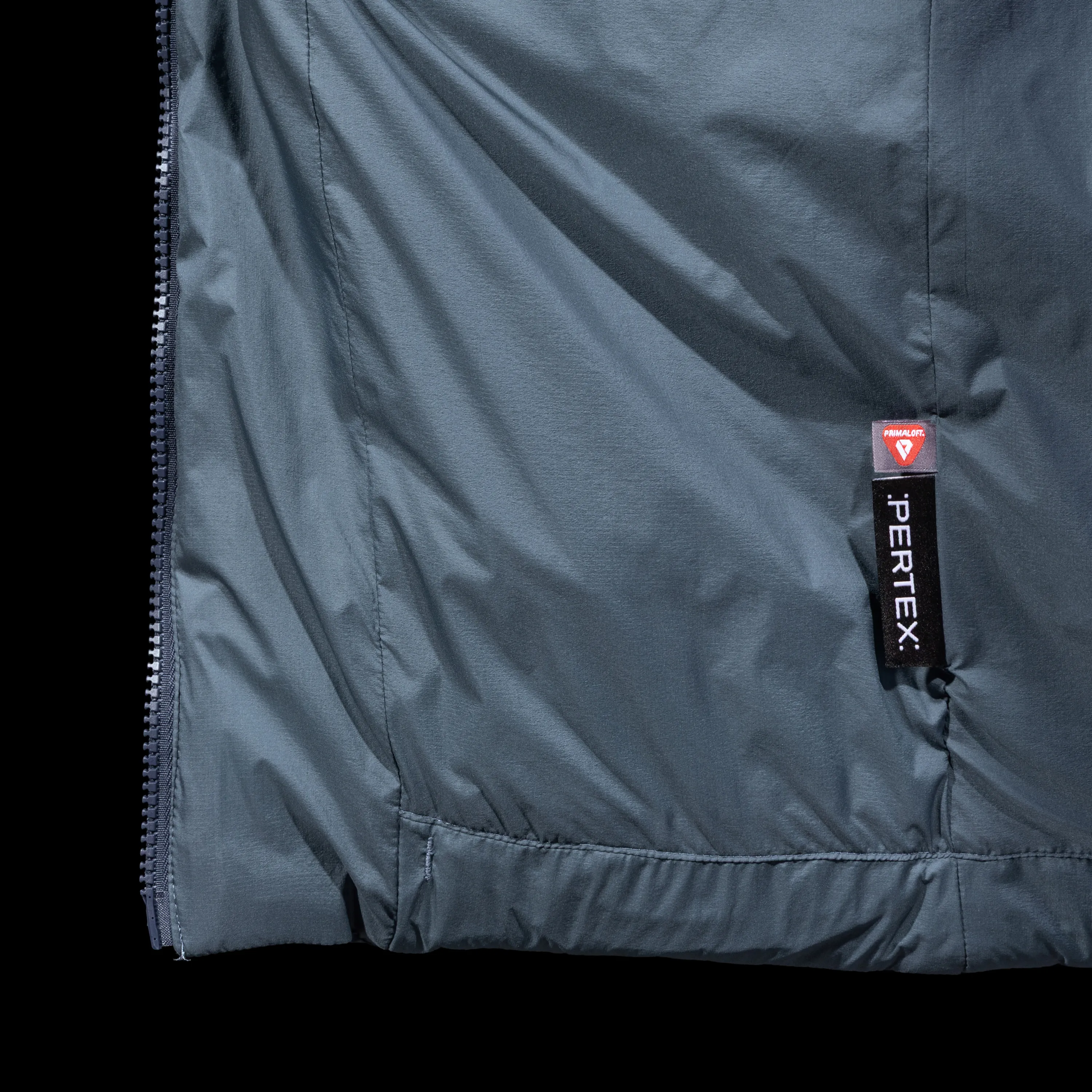 首まわりにもしっかりとダウンを充填し、コールドスポットを軽減。表地は防風性とはっ水性がある、パーテックス カンタムのリップストップ生地を採用。