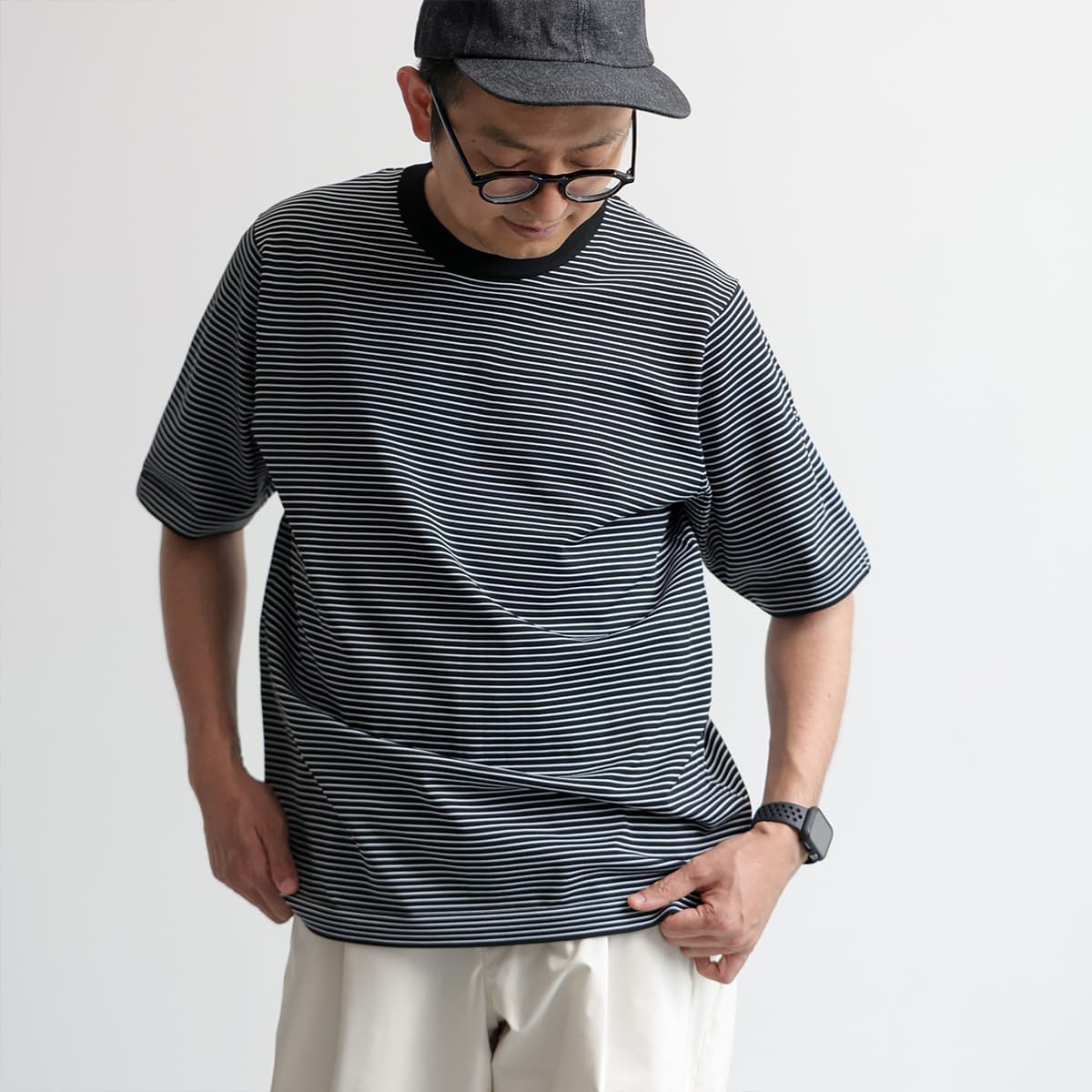 ハイゲージならではの上品さと、程よい肉厚感がある大人のニットT。脇下のベンチレーションで通気性もよく、軽くてシワにならないイージーケア性も優秀な一枚。真夏のスタイリングの強い味方になること間違いなしの逸品です。