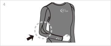 ウエアに袖を通し、スリーブ部分をたぐりよせてから手を通します。 |