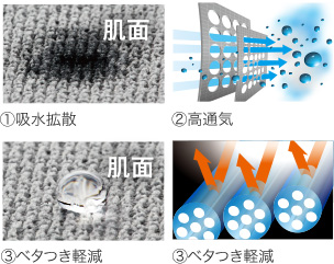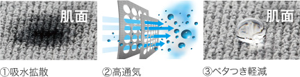 ③さらに、肌面に配した新開発のポリエステル撥水糸がベタつきを防止します。