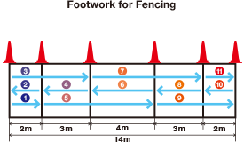6方向フットワーク:総移動距離42mを図のように移動し、合計タイムを測定。