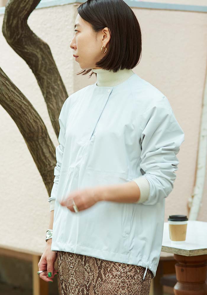 AKANE この<DANSKIN>の③『オールウェザーストレッチ3Lプルオーバー』は、ボタン留めの首元がすっきりしたデザインで、タートルネックのインナーと相性よし。裾のサイドの絞りも、ドローコードが内蔵タイプで機能アイテム感が控えめ。とにかくファッション要素が高いの。休日のお出かけ着に取り入れたい一着!しかも、ストレッチが効いて動きやすい