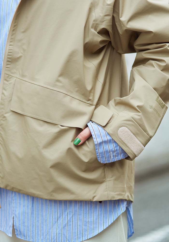 SERI 台風中継のレポーターも着用するくらい、大雨でも対応できる「GORE-TEX」素材を採用したレインジャケットなんです。素材は、通常のGORE-TEXの中でも軽くてしなやかなタイプ。インナーダウンは、環境に優しいリサイクルダウンです。どちらのアイテムも軽量で、小さく畳んでスタッフサックに収納すれば持ち運びしやすい。通勤バッグに忍ばせておきたいですね