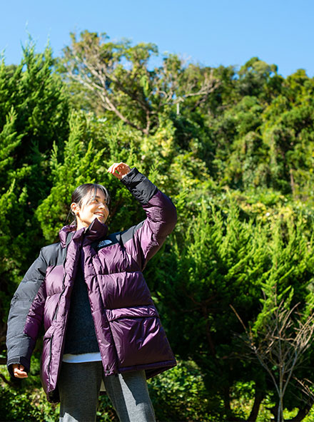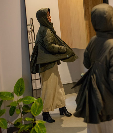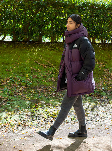 今回は、新色のブラックベリーワインをチョイスしました。一見難しそうなカラーですが、シックなパープルがとてもおしゃれなアクセントになります。チャコールグレーのコーディネート以外にも、淡いブルーのデニム、ブラックのパンツなどとあわせたら素敵だろうなと思いました。ボリュームがありますがとても軽く、着心地が良かったです。個人的には首の部分だけ留めて裾を広げて着るスタイルがバランスを取りやすくお気に入り。フードが手軽に外せるため、雰囲気を変えてスッキリと着ることもでき、重宝しそうだなと思いました。