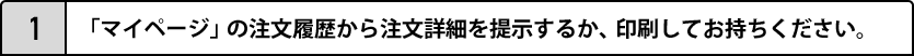 1.「マイページ」の注文履歴から注文詳細を提示するか、印刷してお持ちください。