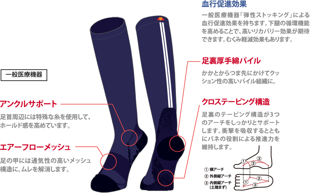 - 一般医療機器「弾性ストッキング」による血行促進効果を持ちます。の循環機能を高めることで、高いリカバリー効果が期待できます。むくみ軽減効果もあります。