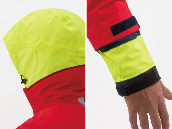 ビルトインタイプの蛍光フードは衿の中から素早く取り出して使用できます。ダブルカフのインナー側にもセイフティカラーを採用。