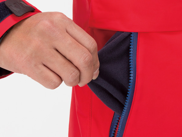 ハンドウォーマーポケットは止水ファスナー仕様で水の浸入を防ぎます。内部の起毛トリコットは引き出して乾かすことが可能です。