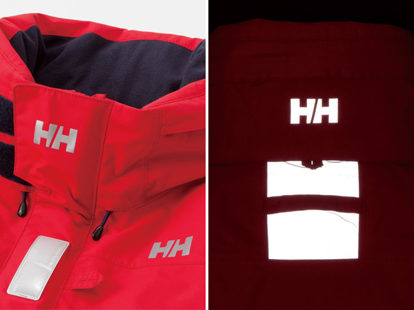 前立て、背中にリフレクティブパッチをあしらい、各所に配したHHロゴはリフレクター仕様。夜間や緊急時の被視認性に優れます。