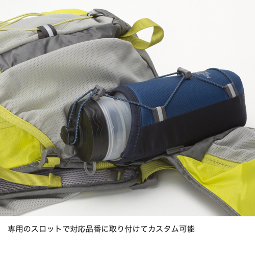 TRコンポーネントシステムは、ボトルホルダーやアクセサリーポケットなどの対応品番を、パックやウェストベルトに装着できるのが特徴です。