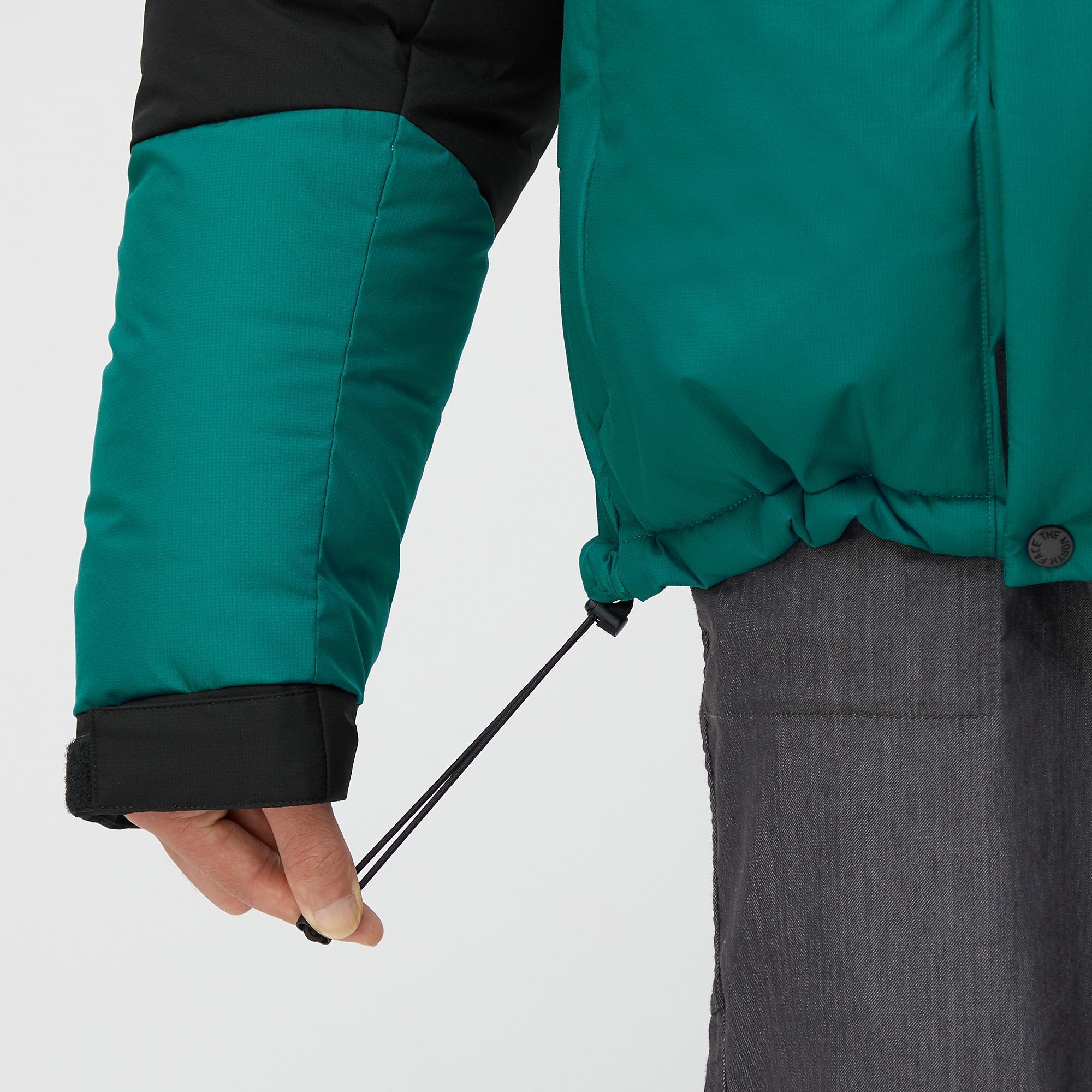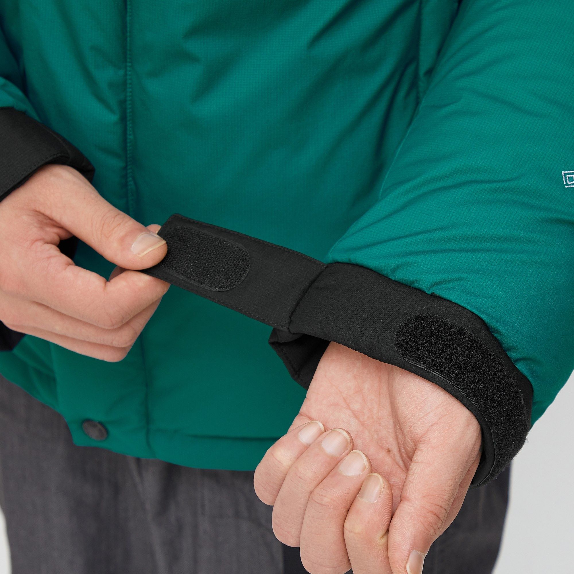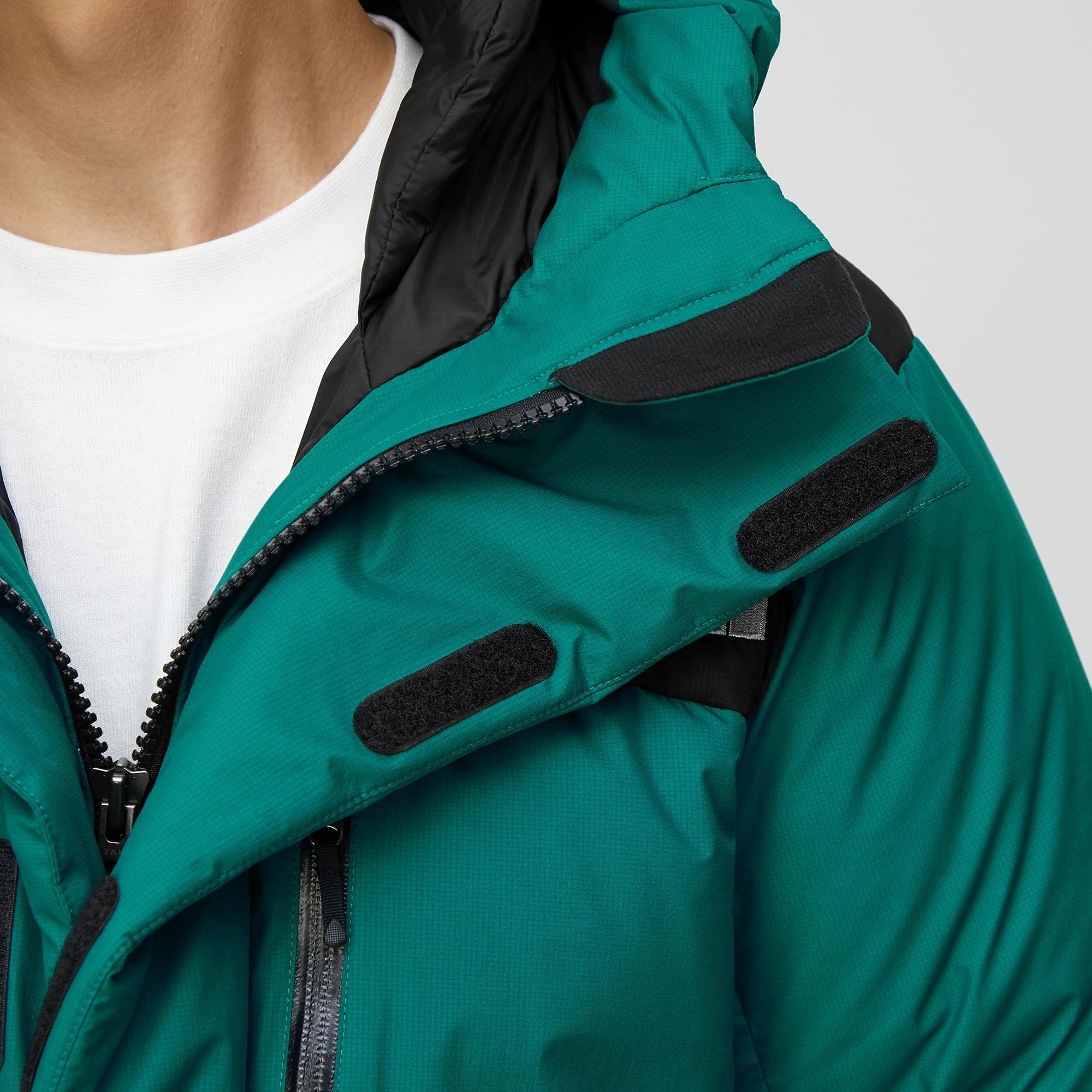 真冬の天体観測や雪上ハイクにも対応できる、高い保温性を持つ防寒ジャケット/フロントダブルフラップ/内側に2つのボトルポケット/ワンハンドアジャスターフーデット/両胸ポケット止水ファスナー/ダウン入り内襟仕様