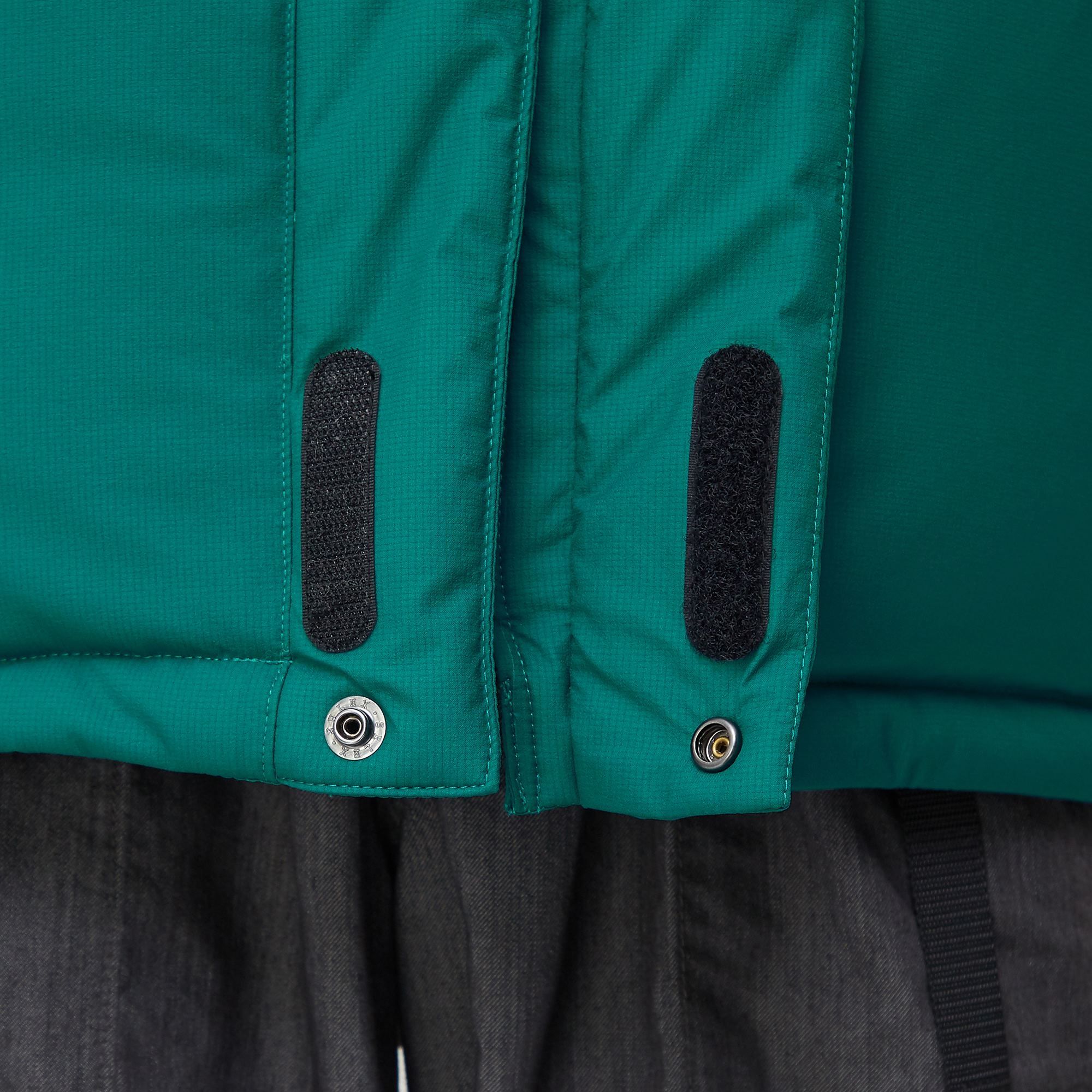 真冬の天体観測や雪上ハイクにも対応できる、高い保温性を持つ防寒ジャケット/フロントダブルフラップ/内側に2つのボトルポケット/ワンハンドアジャスターフーデット/両胸ポケット止水ファスナー/ダウン入り内襟仕様