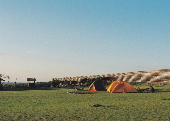 島のラーメン屋で昼食をとり、本拠地となるキャンプ場に向かう。午後のライドに備え、速やかにテントの設営に取り掛かる。各自、テントはソロタイプを持参しており、吉井さんはサイドバッグの中に、西井さんは前輪のフレームに付属、坂本さんはフロントのケージ部に固定してきたそうだ。また3人共、テントと対になるかたちでチェアもフレームに固定してバランスを取っている。なるべく荷物を減らす必要があるため、タープを持参することはあまりない。手短に設営を終えると、再び自転車に乗って道へ繰り出す。重たいサイドバッグから解放されたロードバイクは、路面を求めてウズウズしているように見えた。