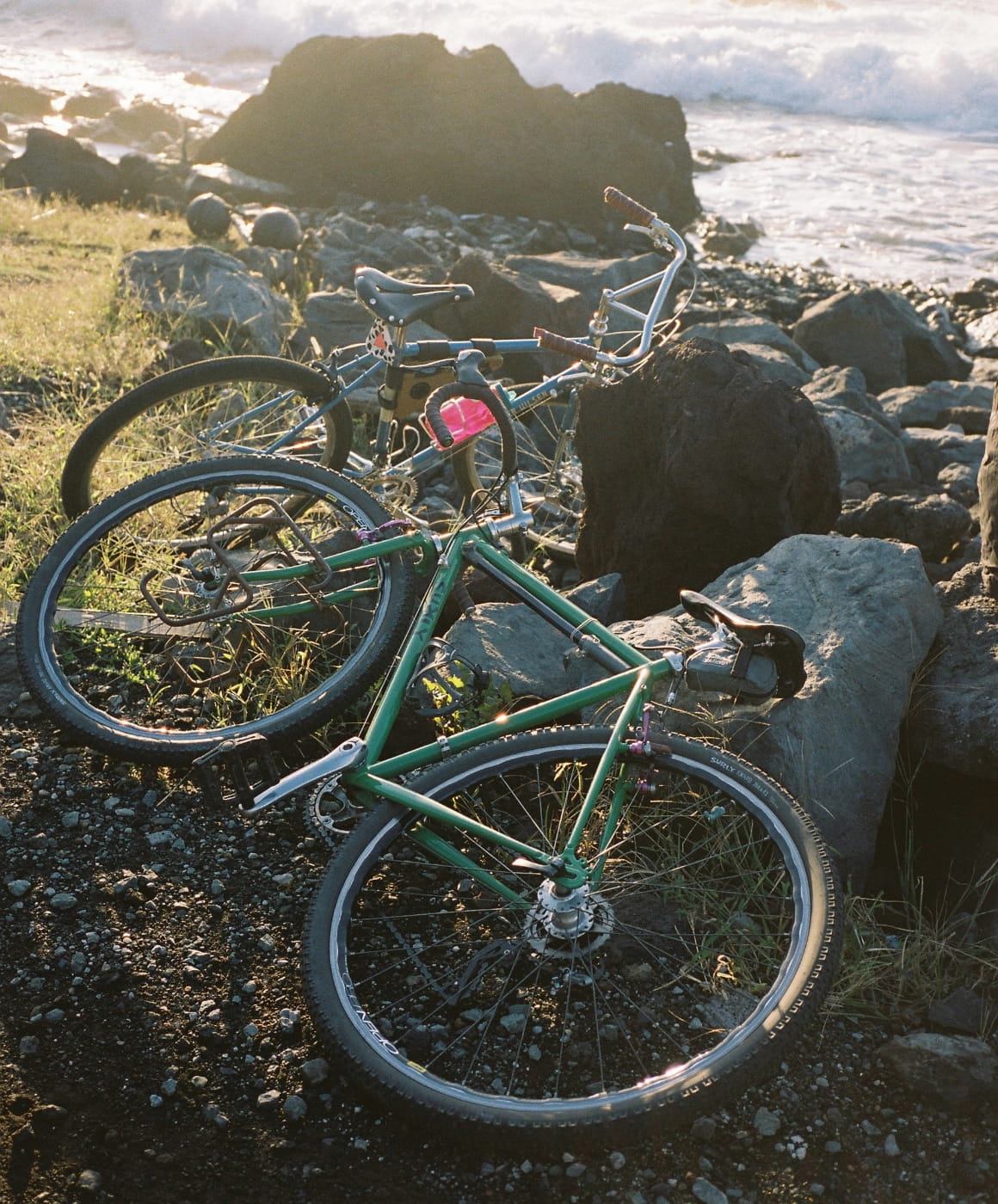 今回の旅の目的地のひとつである、裏砂漠へ。まず3人の前に立ちはだかったのは、未舗装の険しい林道だ。自転車にまたがって進むのはほぼ無理で、少々退屈な時間が過ぎるかと思いきや、そこは BLUE LUG のスタッフ。「あの斜面にタイヤを当てたら、登れそう」と、果敢に道なき道を攻めることを忘れない。坂本さんは、そんな「男子」たちを横目に地道に手押しで自転車を進めていく。ついに到着した、一面の黒い世界。ジャリジャリとした火山灰による大地を嬉々として滑走する3人。「この路面の感触は初めて。そして何よりも、ロケーションに圧倒されます」「マウンテンバイクで来たら、もっと楽しいだろうな」と吉井さんと西井さん。いろんな道を走ってきたけれど、まだまだ知らない道があることを実感する2人であった。