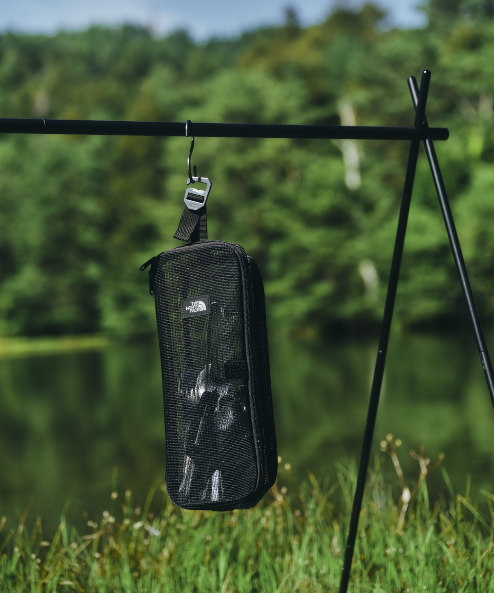 キャンプで使用する各種カトラリーを収納するためのケースです。メインコンパートメントのほかに、上蓋の裏面にもメッシュポケットが付くので、使用前と使用後のカトラリーを分けて収納できます。メッシュインナーは取り外すことが可能で、そのまま吊してドライケースとしても使えます。カトラリーだけでなく、シングルバーナーなどの調理器具ケースとしても使いやすいサイズです。