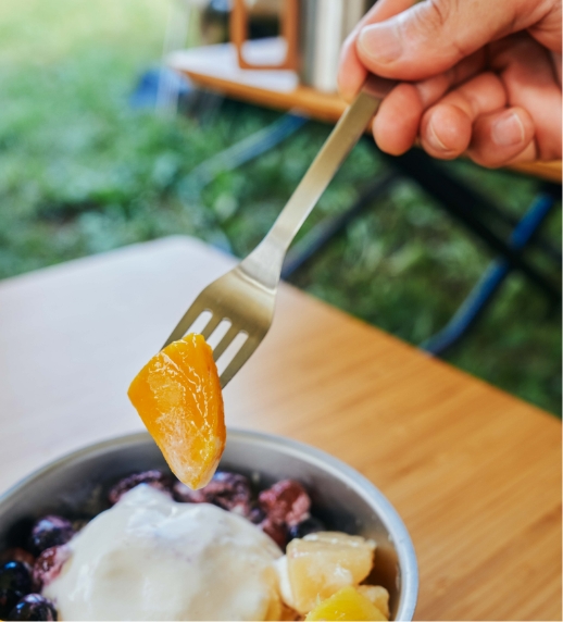 キャンプシーンだけでなく、日常にも溶け込むロングライフデザインのデザートフォークです。丸みを帯びた形状で口当たりも良く、ステンレス鋼を採用することで、頑丈さも兼ね備えています。お子様用としても使いやすい少し小さめのサイズ感です。
