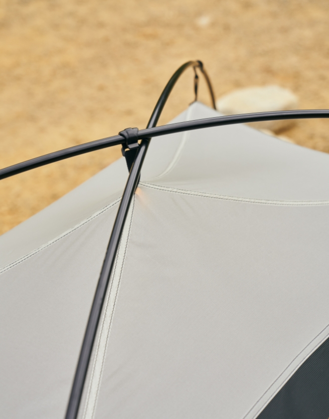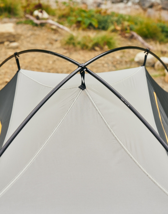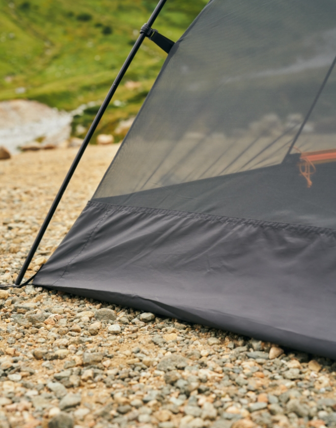 インナーのバスタブ部分と天井以外をフルメッシュにした、通気性の高い自立式3シーズンテントです。ダブルウォールかつドーム型なので強風などにも強く、ミニマルスタイルのキャンプから、低山ハイクまでさまざまなシーンで活躍します。入口は左右二箇所あり、2人で使う際にはお互いに干渉せず出入りできます。両サイドに前室がつくので、荷物を置くスペースも十分に確保しています。