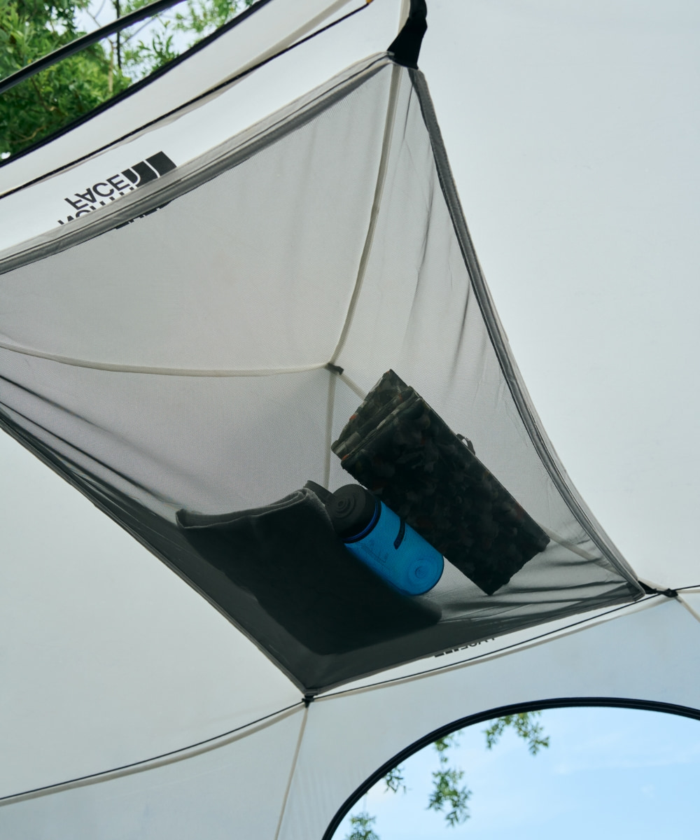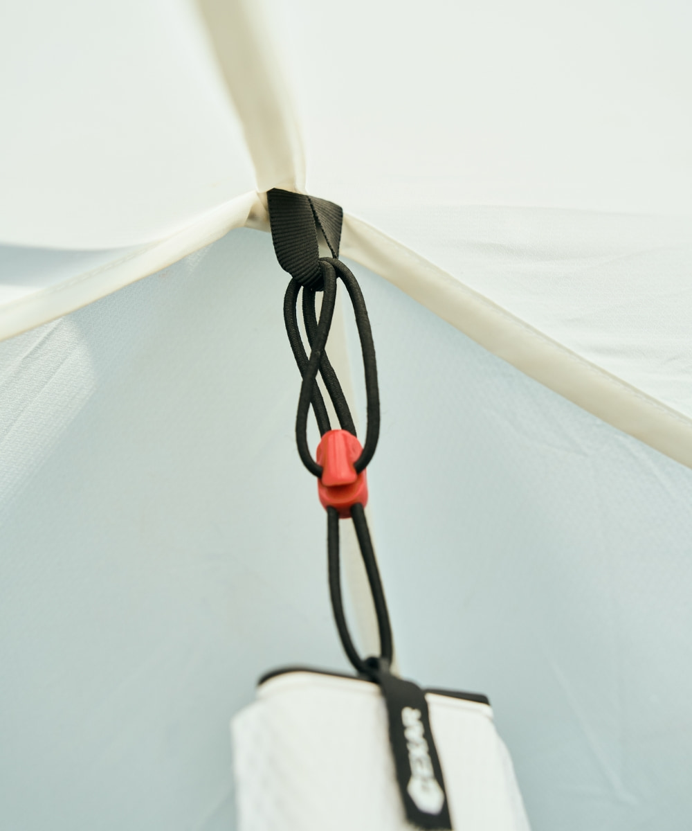 室内天井部には、小型のランタンなどを吊り下げるのに便利な、カラビナ型のハンギングループが付きます。また小物の収納に便利なメッシュポケットも備えています。