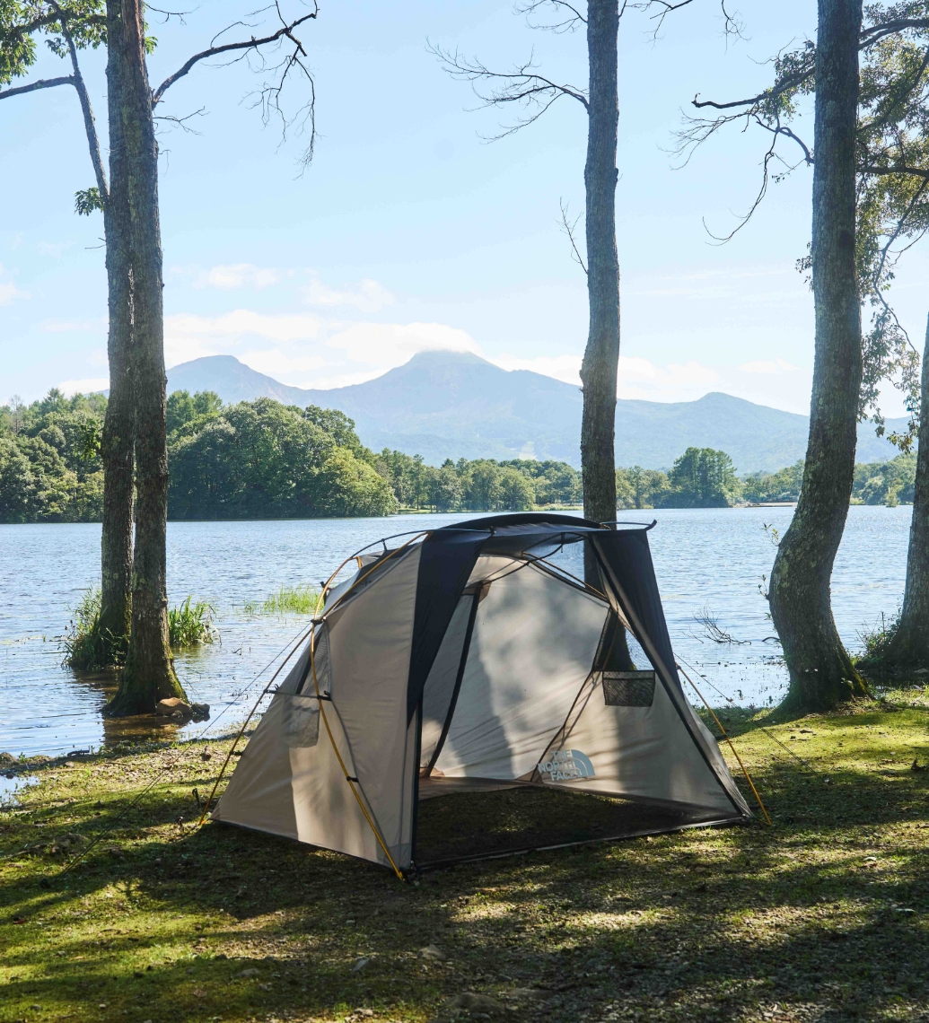 暖かい季節のキャンプなどに適した2人用のサンシェードです。夏の強い日差しに対して高い遮光性は確保しつつ、フロント、リア、さらに天井部にも大型のメッシュパネルを配置することで、通気性も確保しています。大人2人が楽に座れる広さで、キャンプチェアを2脚置いてもゆとりがあります。本来のシェルター的な使い方にくわえて、別売りのフットプリントを使えば、靴を脱いでよりリラックスして過ごすことができます。軽量で持ち運びやすく、キャンプシーンだけでなく、公園でのピクニックやビーチなどでも活躍します。